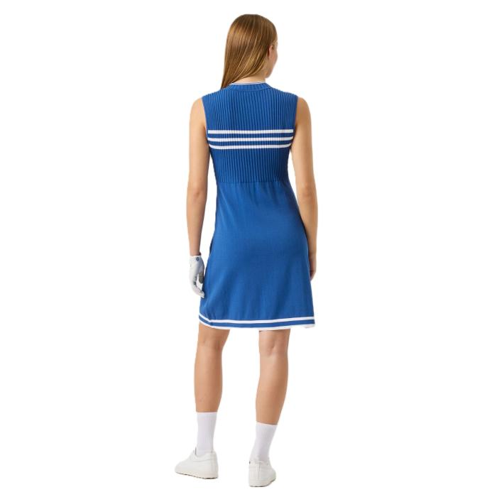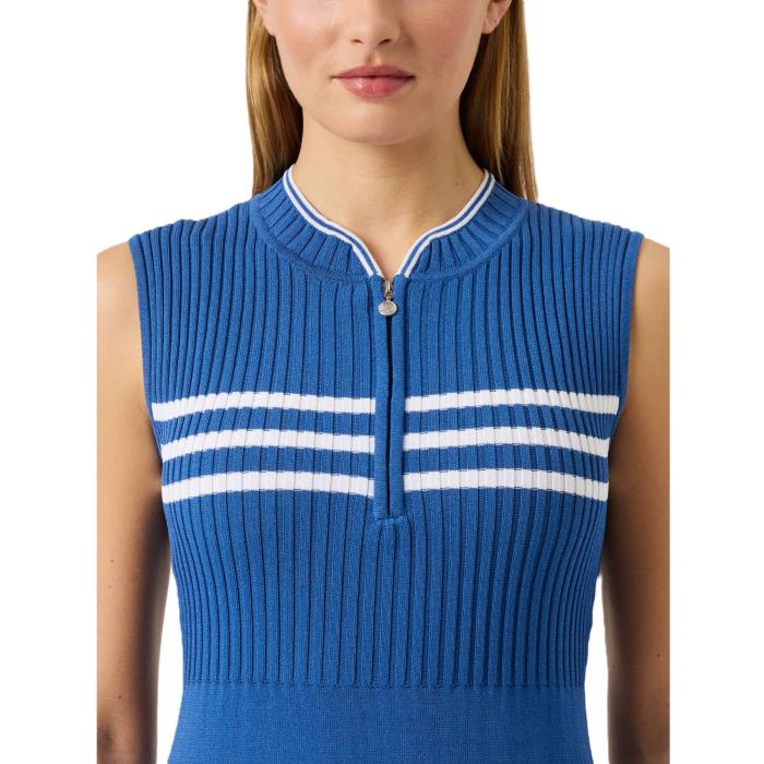 Een verfijnde mouwloze jurk van zachte gebreide stof met een comfortabele, soepele pasvorm. De ribbels op de borst en de contrasterende strepen langs de borst en zoom zorgen voor een flatterend, sportief silhouet. De jurk is voorzien van een halve ritssluiting aan de voorkant voor een strakke afwerking.