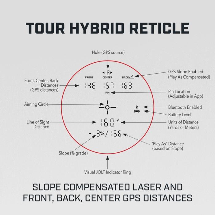 Verhoog je golfspel met de innovatieve Tour Hybrid, de eerste in zijn soort die zowel Slope-gecompenseerde laserafstanden als GPS-afstanden biedt. Met deze geavanceerde technologie maak je altijd de juiste clubkeuze, of je nu de pin raakt of de voor-, midden- en achterkant van de green wilt meten.